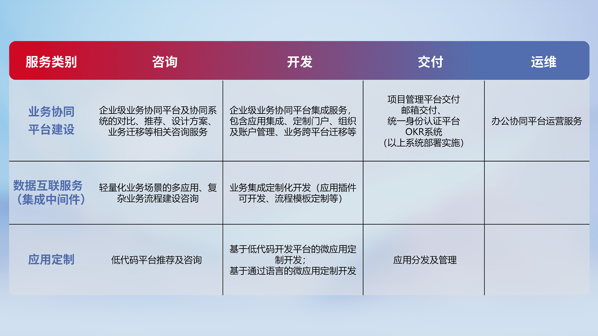 针对钉钉、、、企微、、、、IDaas等平台级产品提供产品的规划、、方案、、、、交付、、、定制化开发等服务,,,,实现如统一协同办公、、、智能客户服务、、混合会议管理、、、智能数据查询、、、等业务场景,,,,实现数字化转型。。。。