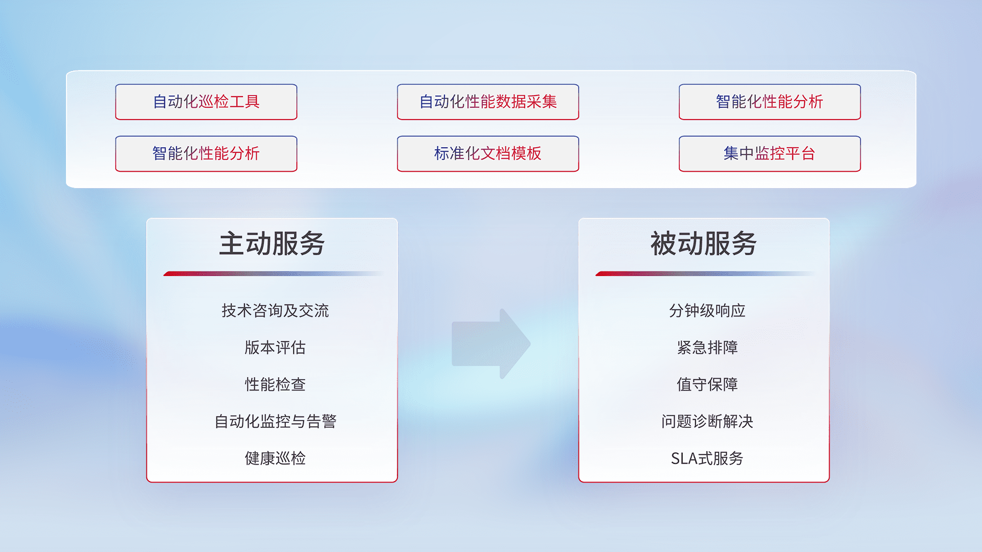智能化工具和标准化文档,,,,保障服务质量,,提供主动服务(包含技术咨询、、、、版本评估、、、、性能检查、、自动化监控与告警、、、、健康巡检)和被动服务包含(分钟级响应、、紧急排障、、值守保障、、问题诊断解决、、SLA服务)。。